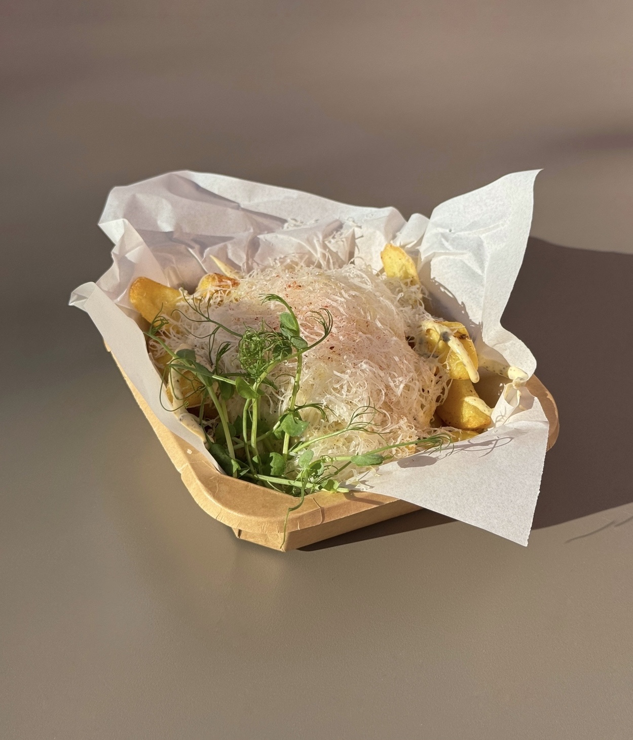 Картопля фрі, смажена курка, сирний соус дорблю, халапеньйо, цибулька кріспі, пармезан.300 г.