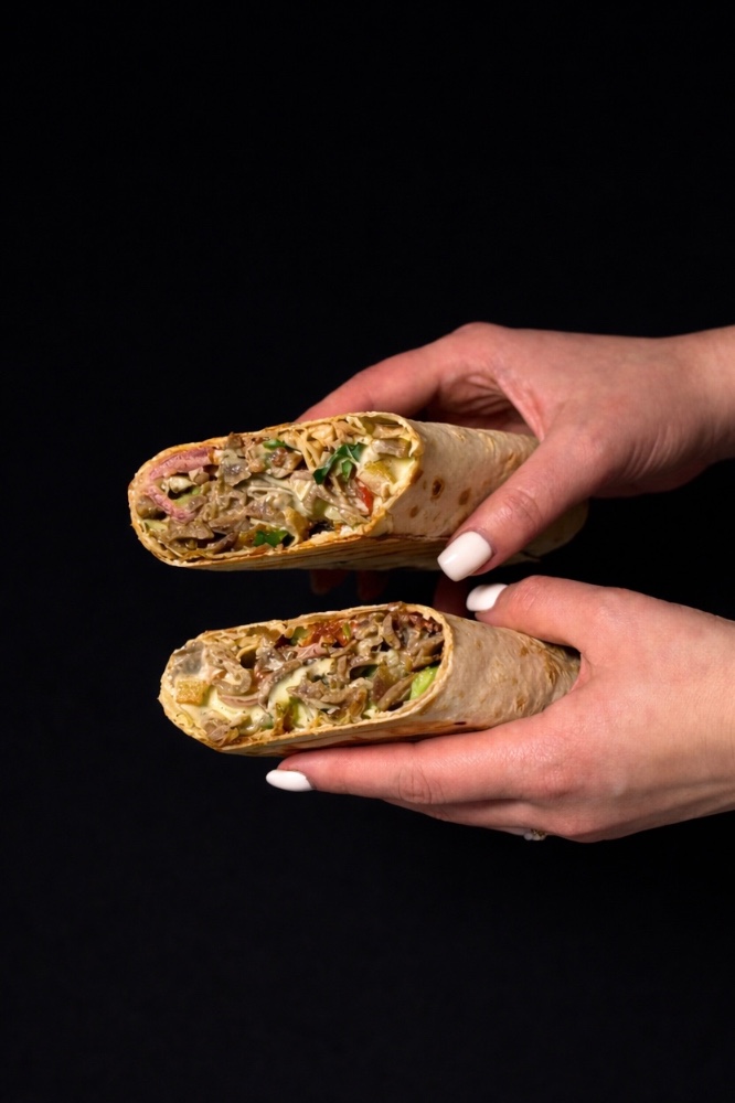 Печений в тандирі лаваш, курка, соус на основі йогурту, огірок, помідор, болгарський перець, маринована цибуля з зеленню.360гр