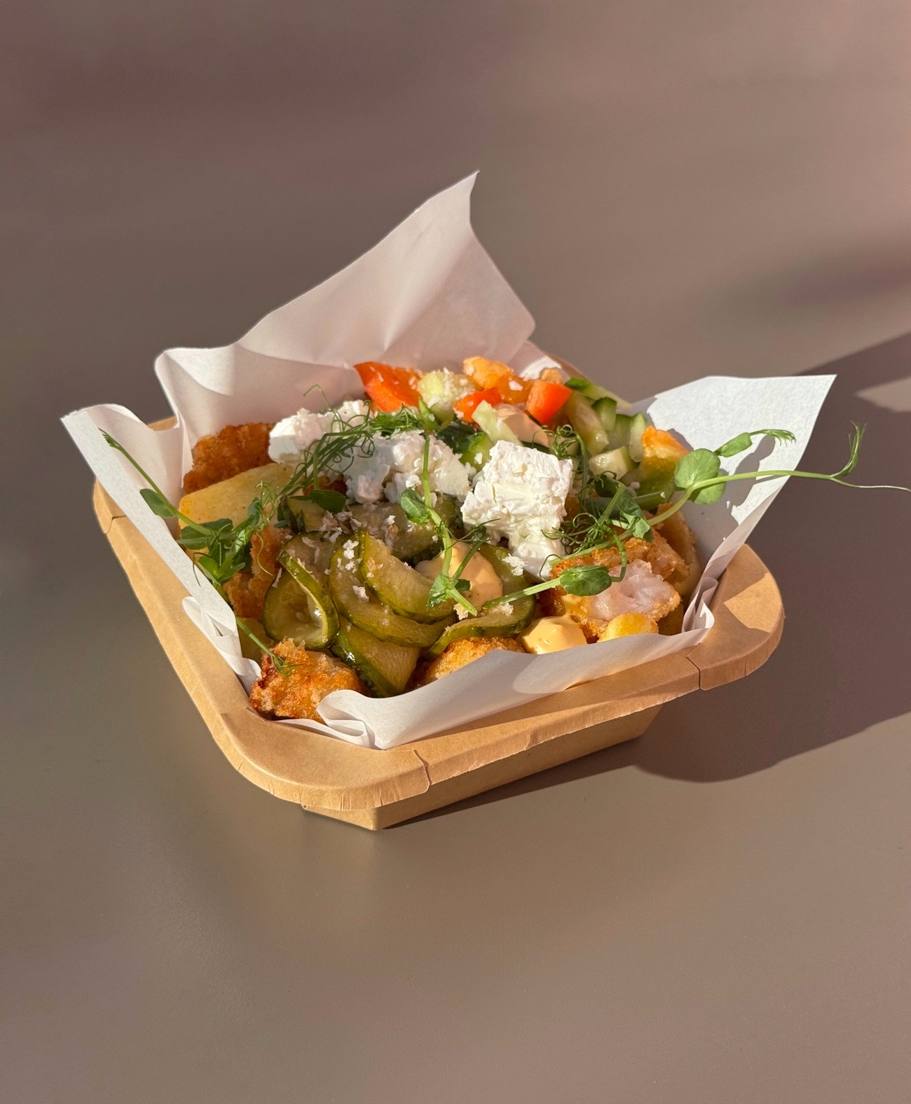 Печений в тандирі лаваш, молода капуста, помідор, мідії, салат чука, цибулеві кількя, картопля фрі, соус з ікрою тобіко.355гр